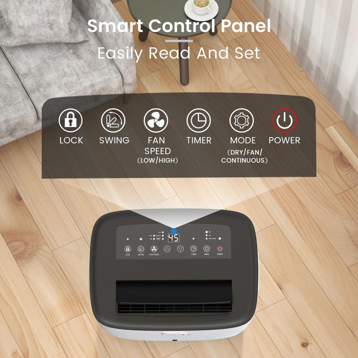 Q: How does the intelligent humidity control work in this dehumidifier?A: The intelligent humidity control feature allows you to set your preferred humidity level between 30% to 80%, adjusting in increments of 5%. This ensures optimal comfort and prevents excess moisture.