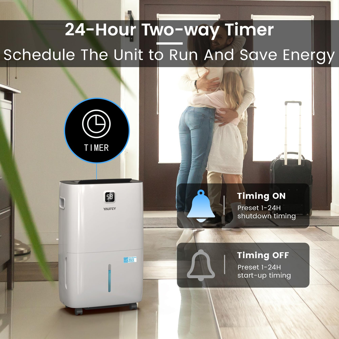 Q: What features enhance the energy efficiency of the Yaufey dehumidifier?A: The Yaufey dehumidifier is ENERGY STAR certified, utilizing advanced rotary compressor technology and smart sensors for humidity control. This helps reduce energy consumption while providing powerful dehumidification, potentially lowering your electricity bill by up to 30%.