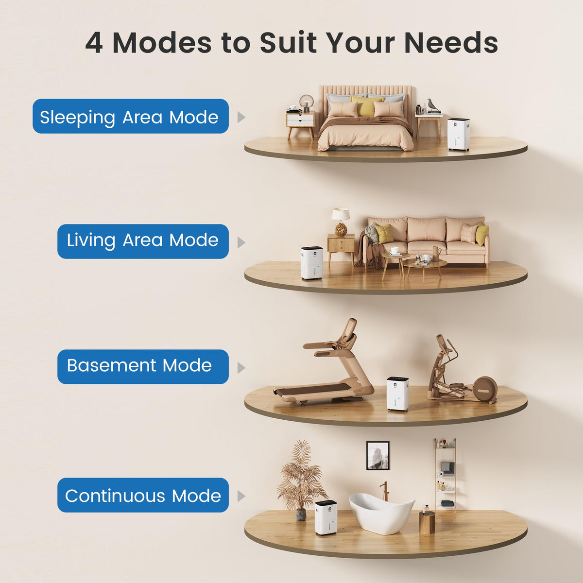 Q: Can the Yaufey dehumidifier operate in different modes?A: Yes, the Yaufey dehumidifier features four operational modes: Sleeping Area (55% RH), Living Area (50% RH), Basement (45% RH), and Continuous (CO), allowing users to customize its performance based on their specific needs.