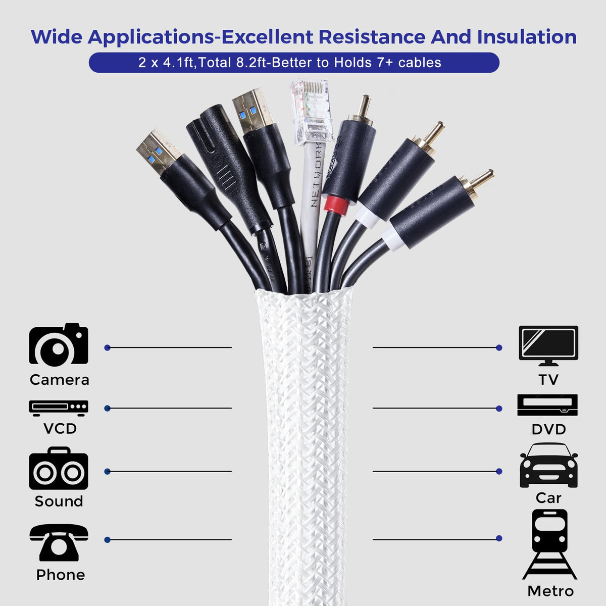 Yclyc Cable Management Sleeves 1In 2 Pack 6.6Ft Split Braided Cable Sleeve White, Cord Protectors From Pets, Wire Organizers F