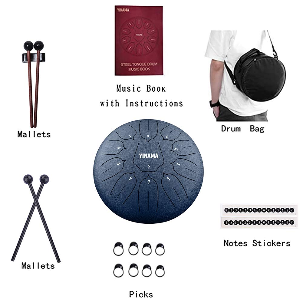 Yinama Steel Tongue Drum 11 Notes 12 Inches Lotus Flower Style There Are No Wrong Notes, You Will Be Played Enough Beautiful Overtones By Hitting With Your Hand Or Drum Malletsprotective Lacquer Finish Guards Against Tarnishing, Scuffs, And Scratchessilicone Feet Stabilize The Drums Position During Playing Great For Camping, Yoga, Meditation, Music Therapy Snd Parties And Also Can Be Used A Interior Decoration To Make Your Indoor Nice And Cozypackage Included:1 X Steel Tongue Drum2 X Pairs Of Drum Mallets1 X Music Book (With Instructions)2 X Set Of Notes Stickers8 X Picks1 X Bag