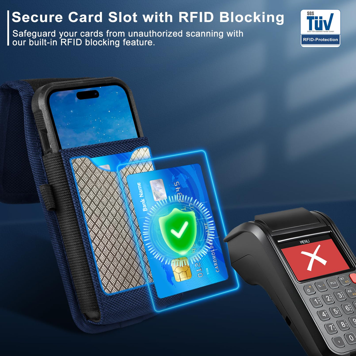 Ykooe Cell Phone Holster Compatible With Iphone 16/15/14/13/12 Pro Max & Plus Models - Belt Clip And Card Holder, Blue, Xl