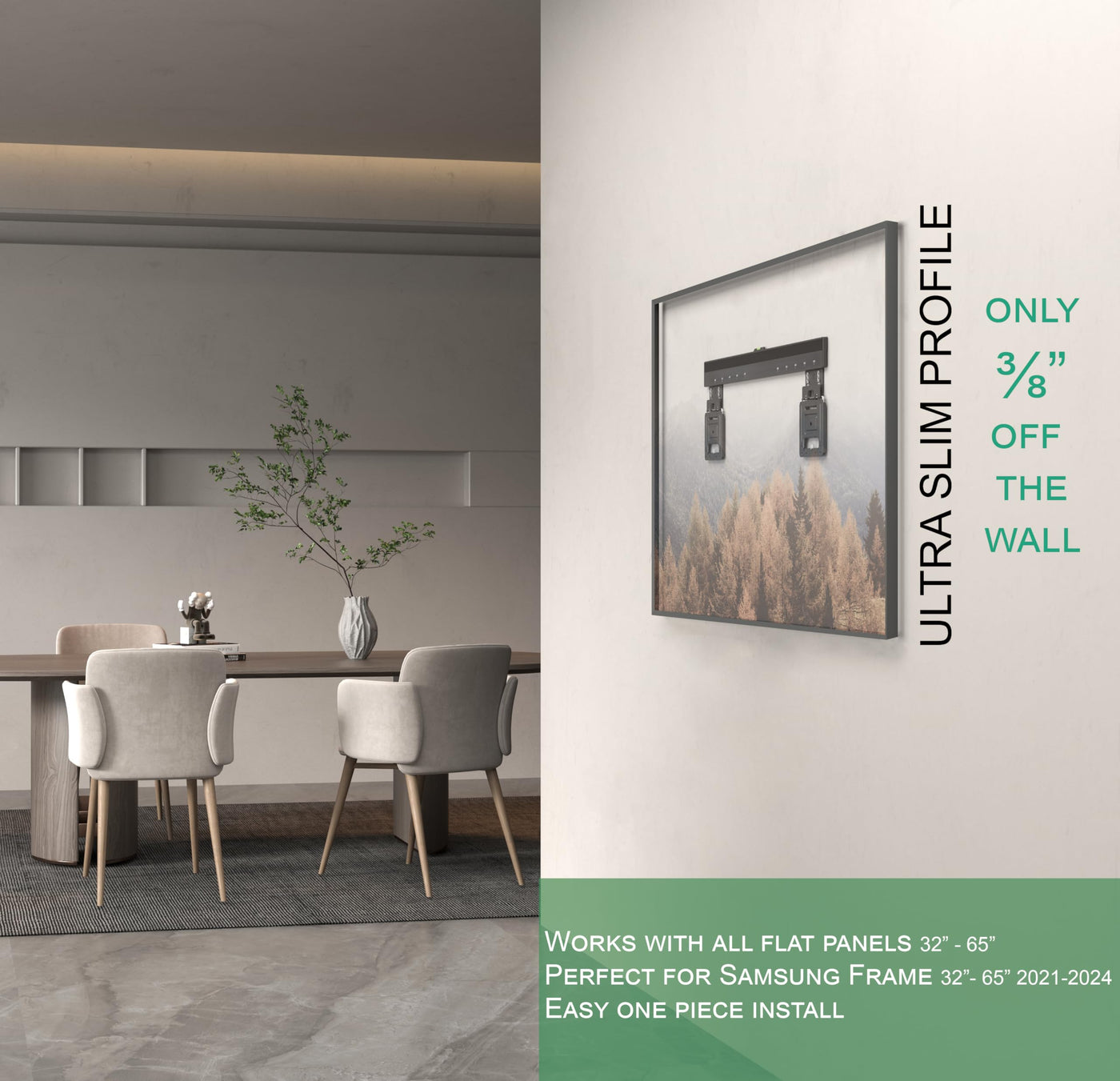 The Ynvision Yn-Slimtv Ultra Slim Wall Mount Was Created To Bring Your Television Very Close To The Wall. Slim But Mighty, This Wall Mount Holds Tvs Flush Against The Wall With Only A .37'' Profile. Perfectly Compatible With Samsung Frame Tvs, It Is Easier And More Simplified To Mount. The Additional Kickstands Also Make Routing Cables And Service To A Recessed Box Behind The Television Easy.