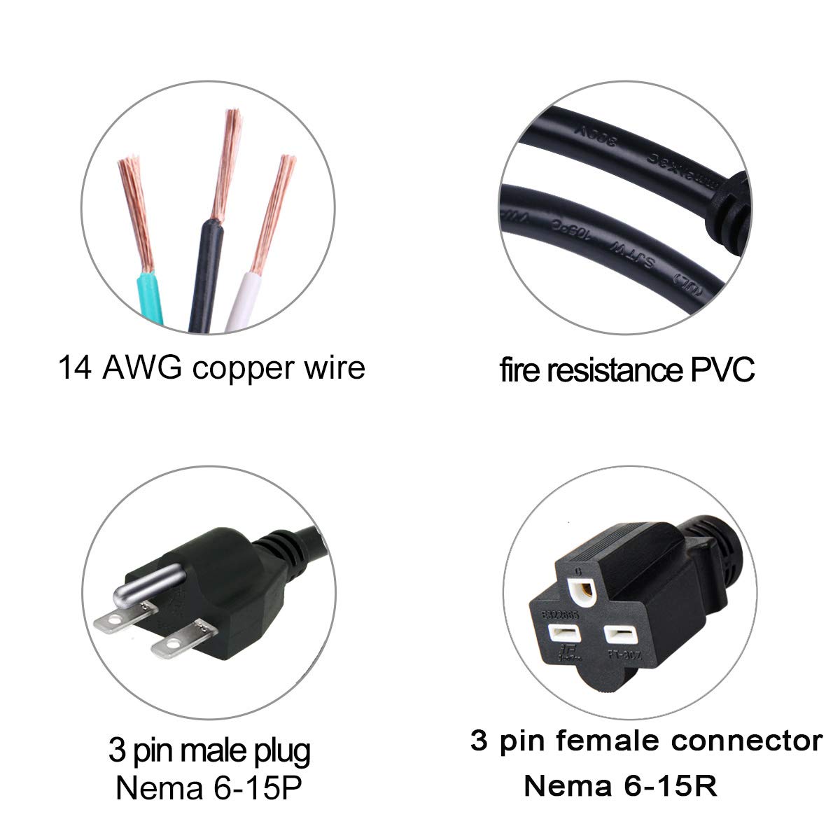 15Ft 14 Gauge Nema6-15P To Nema6-15R 3 Prong Power Extension Cord Cord Length: 15 Ft Color: Black Jacket Cable: Sjtw Material: Copper, Pvc Wire: 14 Gauge 105? Weather/Water/Fire Resistance The Good Quality Of The Sjtw Cable 105? With The Ft-1 Level Fire Resistance.Resists Moisture, Abrasion, And Exposure To Sunlight,Suitable For Indoor/Outdoor Using