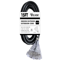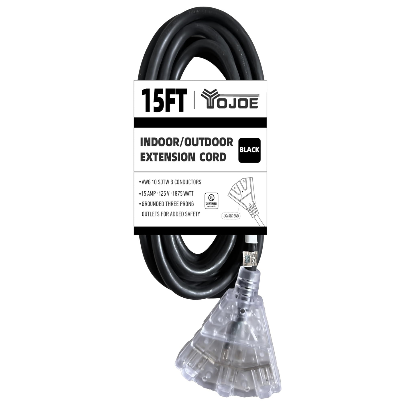 Yojoe 15 Foot 10/3 Lighted Outdoor Extension Cord With 3 Power Outlets 10 Gauge 3 Prong Sjtw Heavy Duty Black Extension Cable