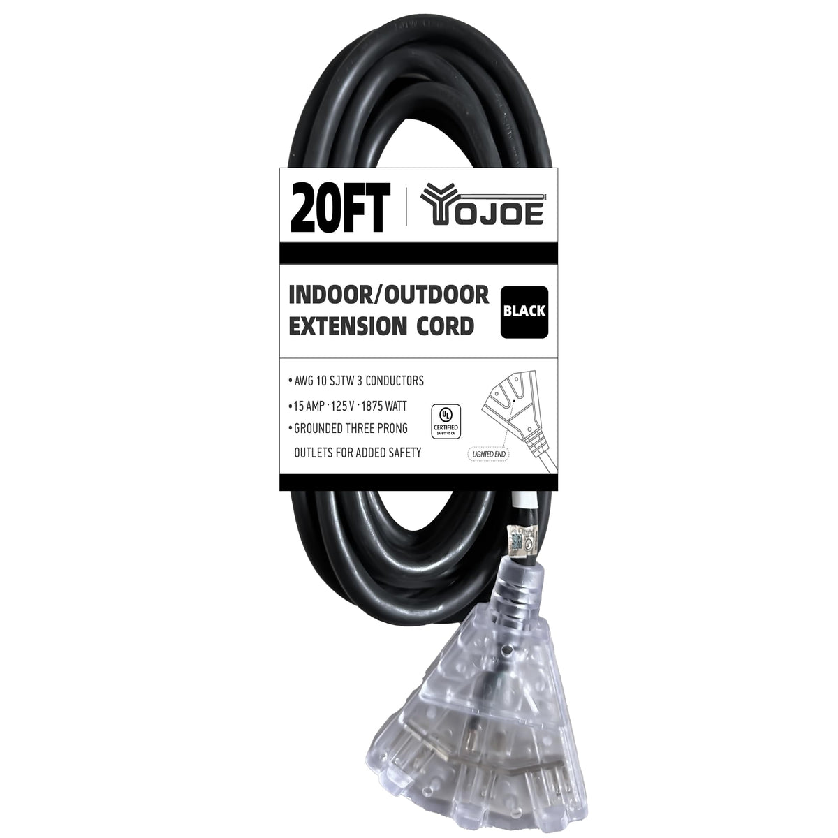 Yojoe 20 Foot 10/3 Lighted Outdoor Extension Cord With 3 Power Outlets 10 Gauge 3 Prong Sjtw Heavy Duty Black Extension Cable