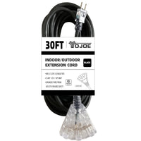 Yojoe 30 Foot Black Extension Cord, Lighted Outdoor 12/3 Cord With 3 Power Outlets, 12 Gauge 3 Prong Sjtw Heavy Duty Extension C