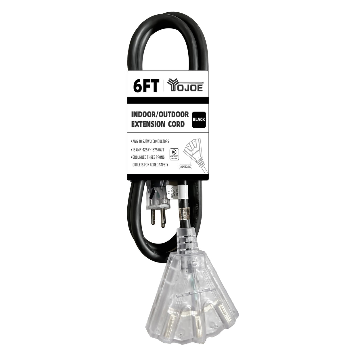 Q: Does the YOJOE extension cord have safety features?A: Yes, the YOJOE extension cord includes a lighted end that indicates when power is active, enhancing safety during use. Additionally, it has a three-prong grounded plug for added stability and protection.