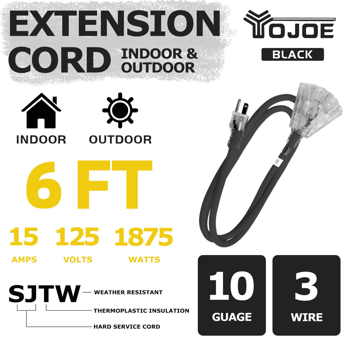 Q: Can I use the YOJOE extension cord for outdoor applications?A: Yes, the YOJOE extension cord is designed for both indoor and outdoor use. Its weatherproof features allow it to withstand various outdoor conditions, making it ideal for tools like lawn mowers and outdoor lighting.