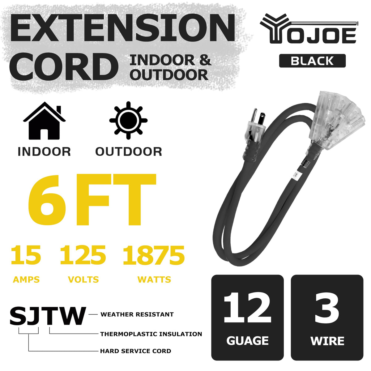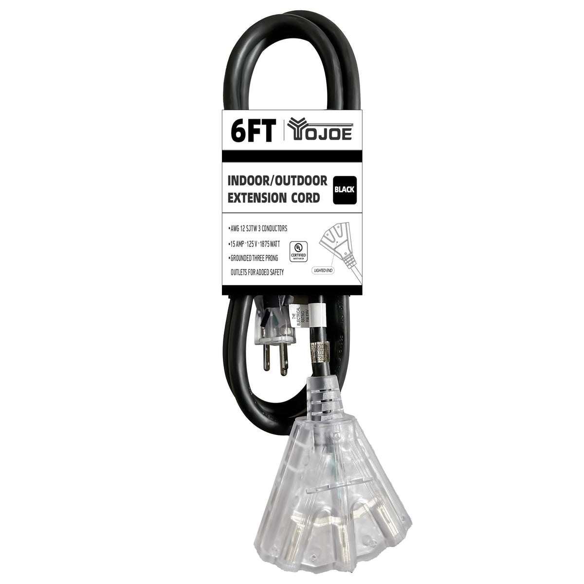 Yojoe 6 Foot Black Extension Cord, Lighted Outdoor 12/3 Cord With 3 Power Outlets, 12 Gauge 3 Prong Sjtw Heavy Duty Extension Ca