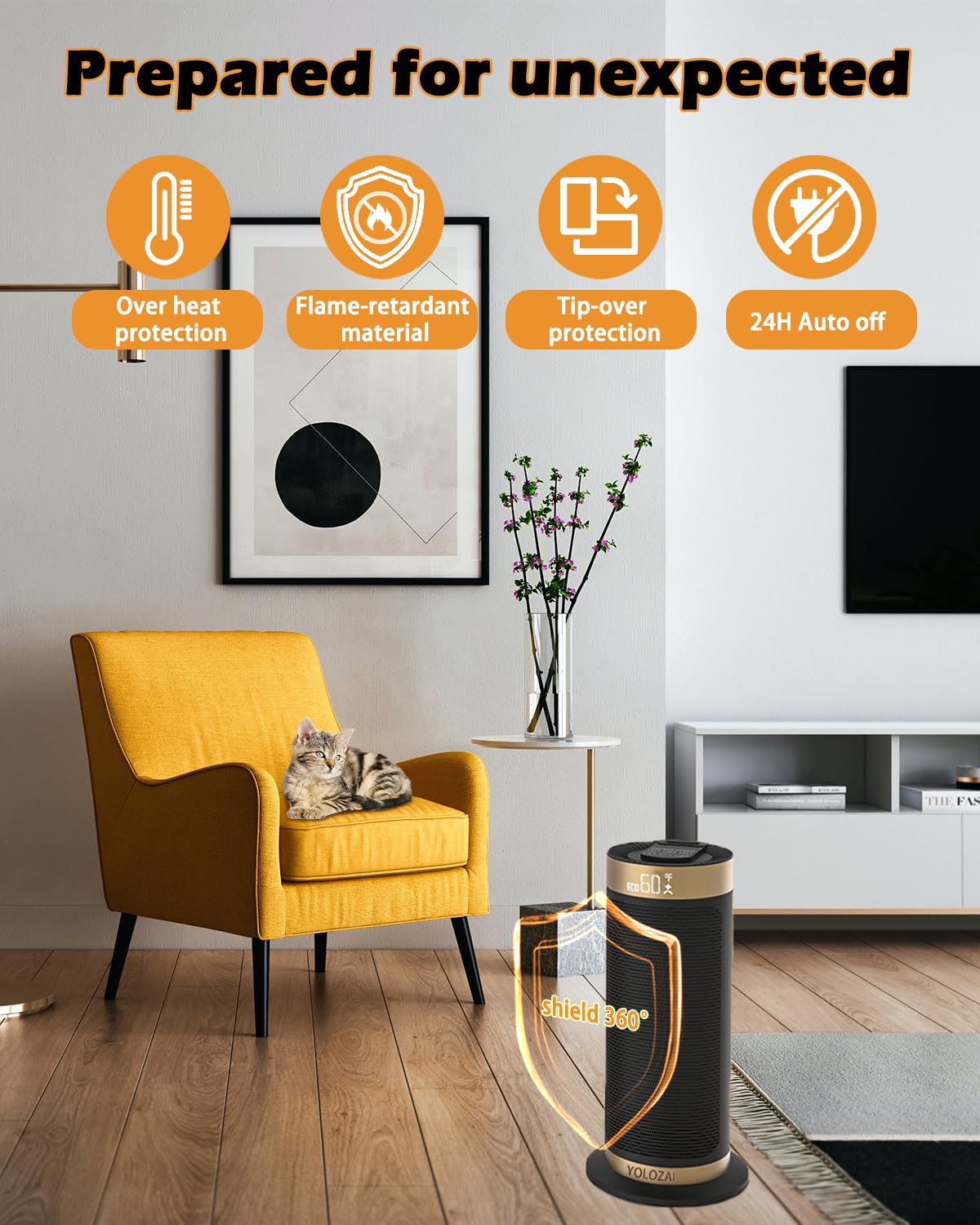 Q: What safety features does the YOLOZAI Space Heater have?A: This space heater is equipped with multiple safety features, including tip-over auto shut-off, overheat protection, and a 24-hour auto-off function, ensuring safe operation at all times.