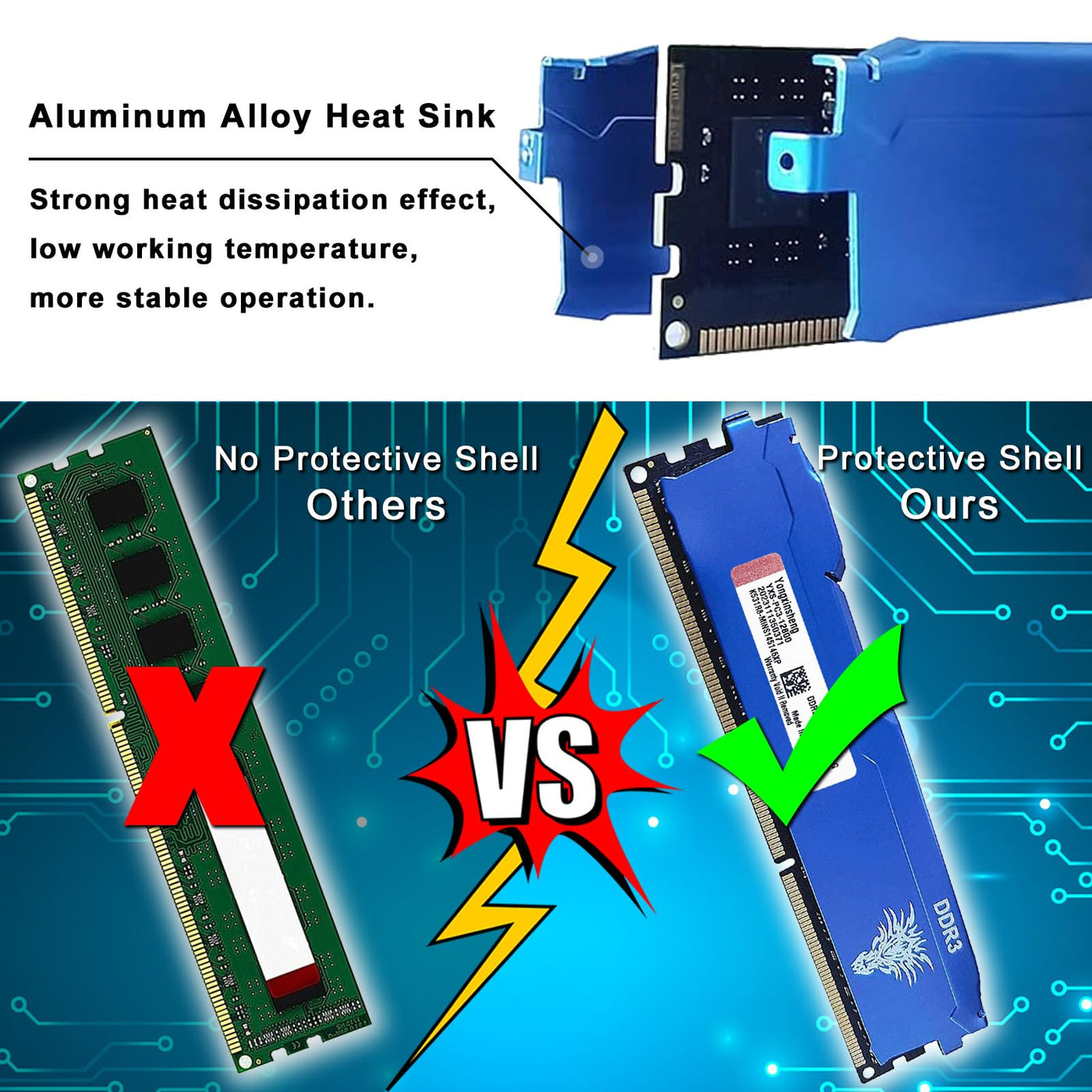 Q: How does the heat dissipation feature work in this RAM?A: The Yongxinsheng DDR3 RAM features a unique thermal design and an aluminum alloy heat-drawn net that helps dissipate heat effectively, ensuring stable performance during extended use.