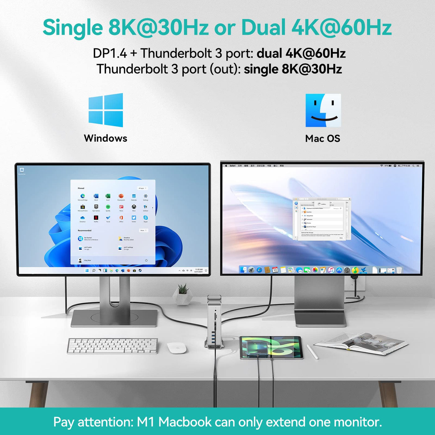 Q: Can I connect dual monitors using this docking station?A: Yes, the Yottamaster docking station supports dual 4K displays at 60Hz via the Thunderbolt 3 port and DisplayPort 1.4. It can also handle a single display of up to 8K at 30Hz or 5K at 60Hz.