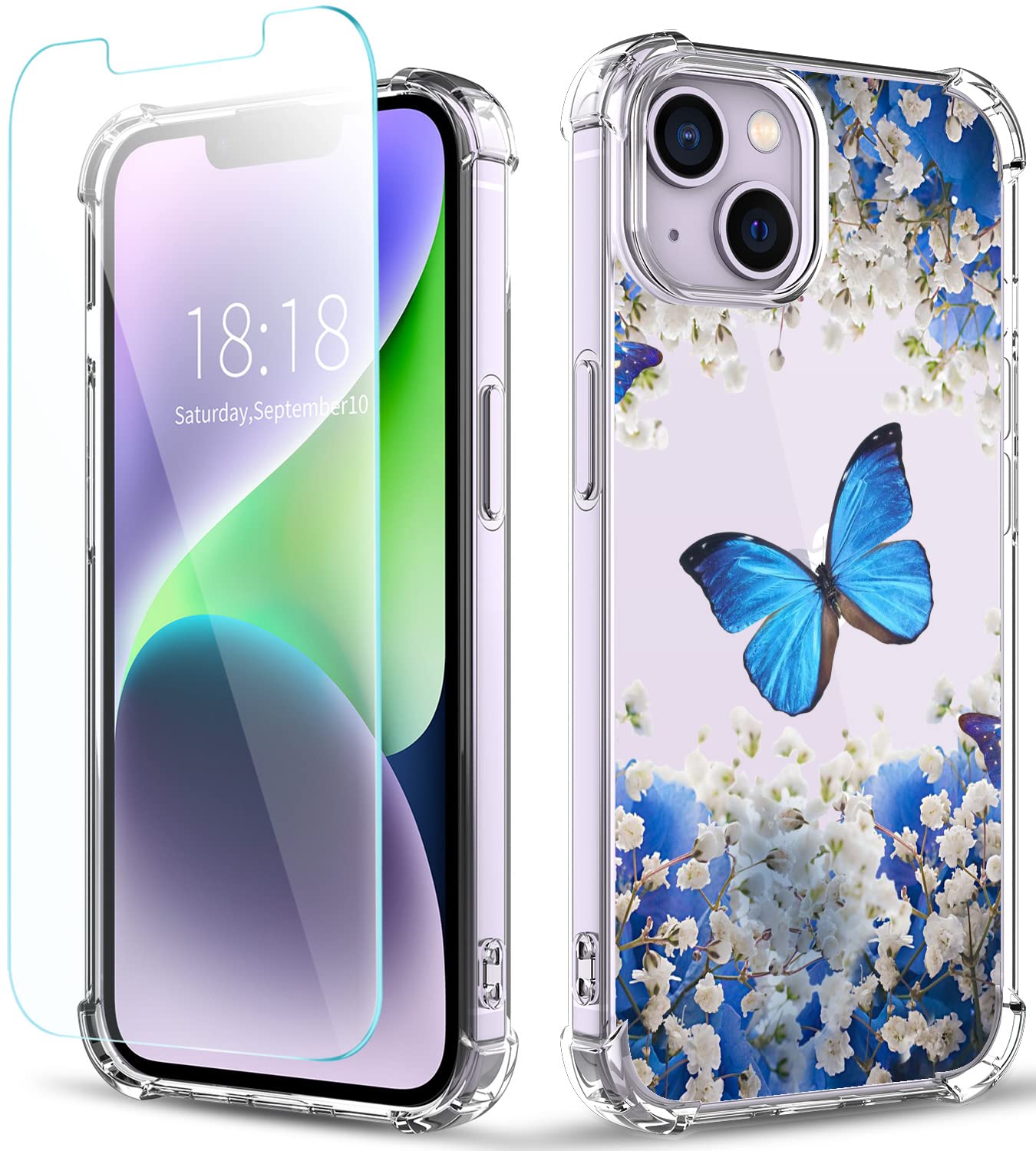 Yoyori Iphone 14 Plus Case With Screen Protector, Flower Pattern Design, Floral Clear Women Phone Case Shockproof Protective Sof
