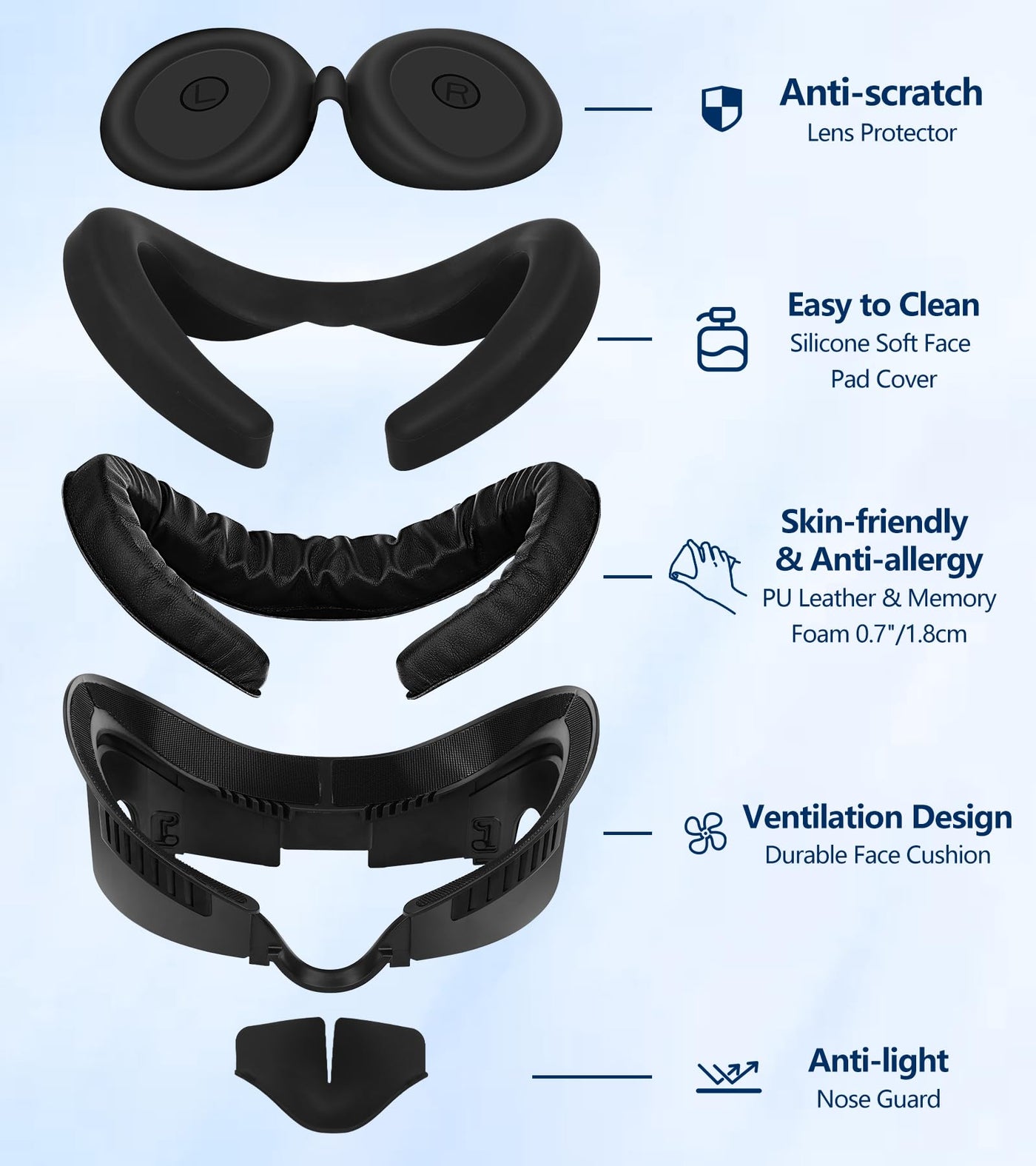 Oculus Quest 3 Face Pad Replacement, Oculus Quest 3 Face Pad Replacement, Facial Interface Removable Nose Guard For Oculus Quest 3, Sweat-Proof Pu Foam Cushion Enhance The Comfort Of Your Oculus Quest 3: Our Facial Interface Is Made From Soft, Breathable Made Of Thick Pu Leather With Inside Sponge Foam And Memory, Provides Superior Wearing Comfort And Sweatproof, Ensuring You'Re Comfortable When Using Oculus Quest 3 For Extended Periods Of Time. Personalized Fit: The Precisely Designed Facial Interface Padding Perfectly Fits Oculus Quest 3, Ensuring A Tight Fit That Not Only Provides The Best Vision But Also The Best Wearing Experience. Facial Interfaces Are Easy To Clean And Resist Sweat, Allowing You To Enjoy A Fresh Vr Experience At Any Time. Ventilation Design: Our Masks And Facial Interfaces Feature Carefully Designed Ventilation Systems And Vents, That Effectively Reduce Lens Fogging And Provide A Clear Visual Experience. < Br//>Anti-Light Leakage: The Sturdy Design Ensures Minimal Light Leakage, And Blocks The Light, Allowing You To Fully Immerse Yourself In The Virtual Reality World. Thickened Design For Wearing Glasses: Meta/Oculus Face Plate Thickened Design Not Only Provides Additional Protection But Also Provides A Wider Wearing Space For Users Who Wear Glasses Kids, Allowing Everyone To Enjoy Oculus Quest 3. Improve Your Gaming Experience: This Facial Interface Not Only Provides Superior Comfort And Cleanliness But Also Significantly Enhances Your Vr Gaming Experience, Allowing You To Immerse Yourself Deeper Into The Game World. Easy Replacement: The Wide Facial Interface Can Be Easily Replaced, Ideal For Sharing The Device With Multiple People