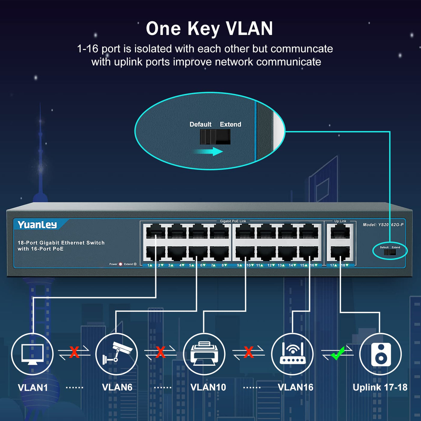 Yuanley 16 Port Gigabit Poe Switch With 2 Gigabit Uplink, 16 Poe+ Port 1000Mbps, 250W 802.3Af/At, Metal Desktop/Rackmount, Unman