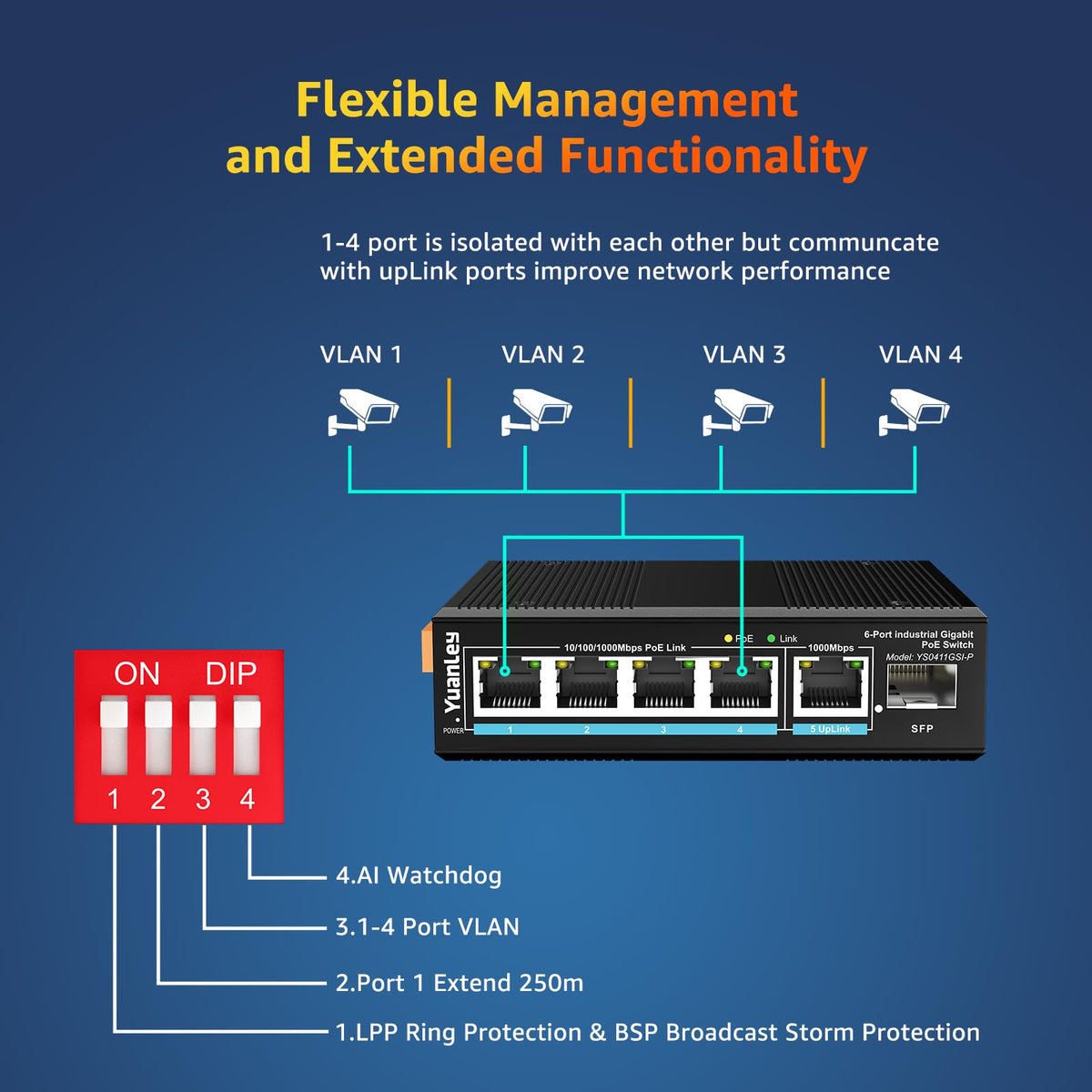 Q: Can I use this switch for my IP cameras and wireless access points?A: Yes, the YuanLey 6 Port Industrial Switch can supply power to network devices such as IP cameras and wireless access points via its PoE ports. This capability makes it a perfect solution for high-density PoE power supply needs in various applications.