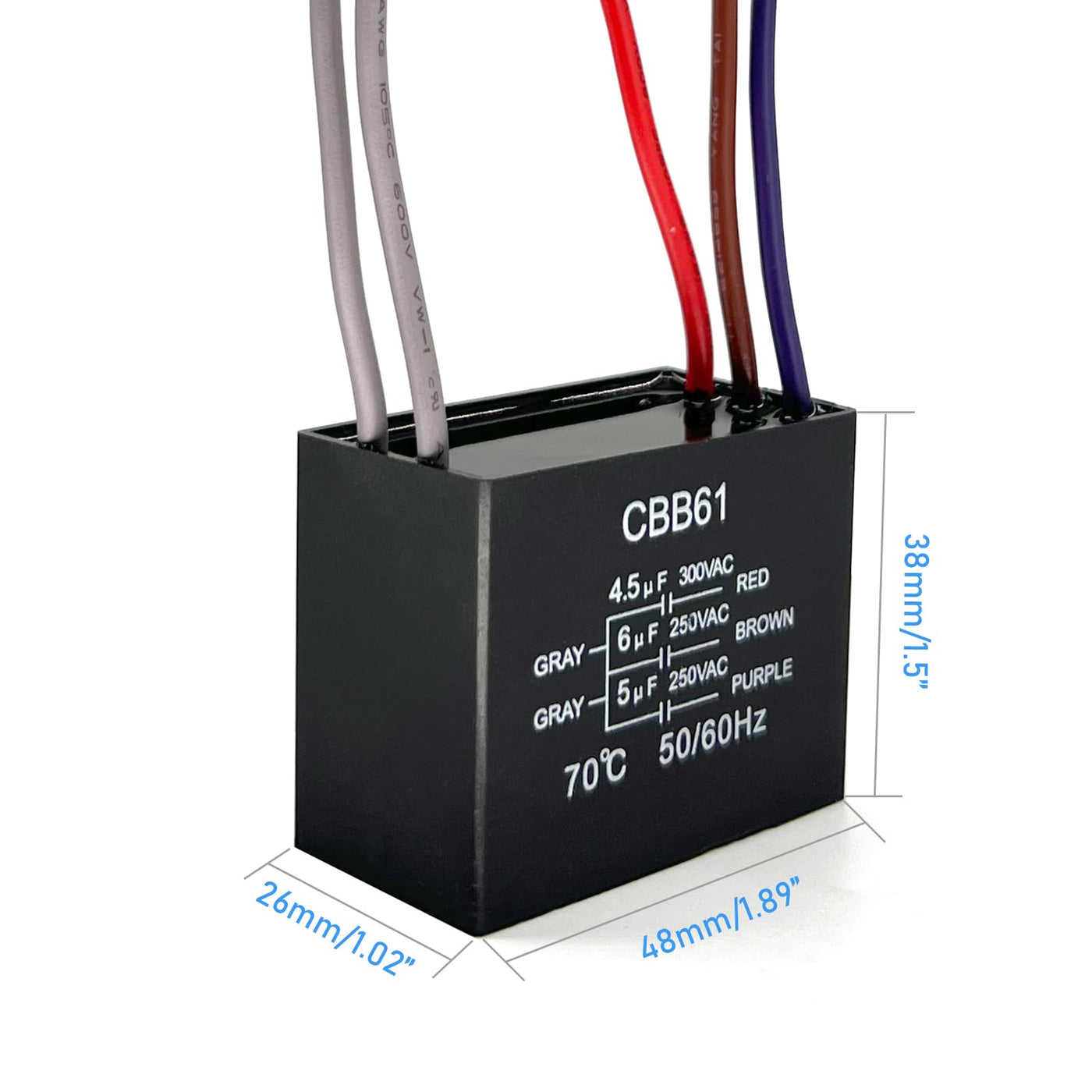 Come With Ceiling Fan Pull Chain Switch And Ceiling Fan Capacitor. The Combination Of The Ceiling Fan Switch And Fan Capacitor Lets The Fan Have 3 Speeds (High-Med-Low-Off). Ceiling Fan Pull Chain Switch: 3-Speeds 4 Wires. Ceiling Fan Capacitor: Cbb61 4.5Uf + 6Uf + 5Uf, 5 Colored-Wires 250V 1, If The Fan Does Not Start, Or If The Fan Speed Decreases, Check This Capacitor Firstly. This Capacitor Controls The Starting And Stopping Of The Fan, As Well As The Speed Regulation. It Is Widely Used In Most Fans With Ac Motors. 2, This 5-Coloured Wires Capacitor Is Cbb61 4.5Uf + 6Uf + 5Uf, Each Wire Length 115Mm, The Capacitor Body Size 48X38X26Mm. 3, Please Record The Wire Connection Before Change The Capacitor In Your Fan. 4, Not Only Fans, It Is Also Widely Used Other Motors Such As Air Conditioner, Washing Machines, Micro Water Pumps, Etc..