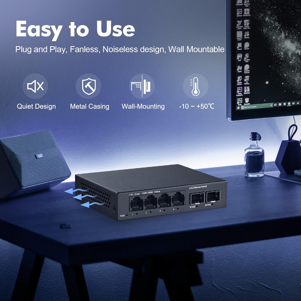 Yulinca 6 Port 2.5G Unmanaged Switch, 4 X 2.5Gbase-T Ports With 2 X 10G Sfp+, Metal Mini Case, 60Gbps Switching Capacity, Fanless Plug & Play 2.5Gb Network Switch