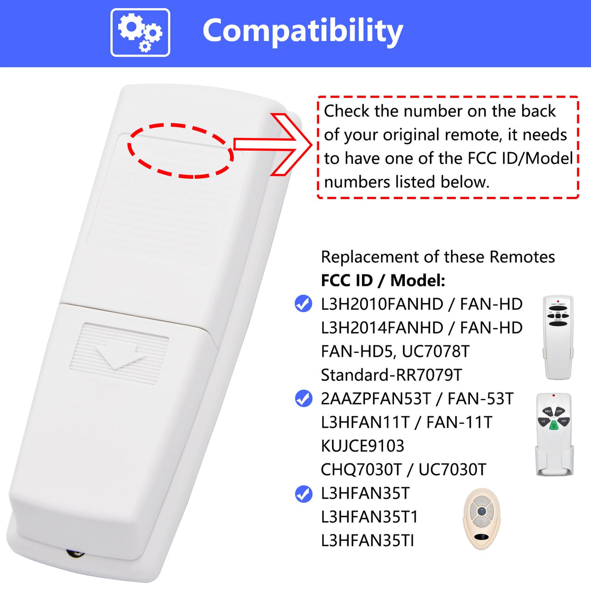 Q: Is this yunbei ceiling fan remote compatible with all ceiling fans?A: No, this yunbei ceiling fan remote control is specifically designed as a replacement for UC7078T and FAN-HD models used in Hampton Bay and Hunter ceiling fans. It operates at a frequency of 303.9MHz, so ensure your original remote matches the model numbers listed.