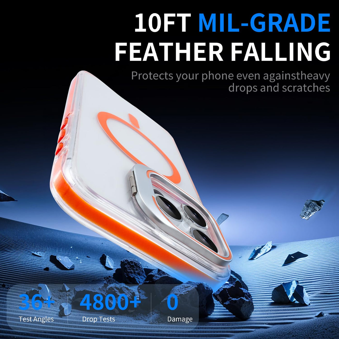 Q: What type of protection does this case offer?A: This case provides 10FT military-grade drop protection, with a specially designed four-corner shockproof structure and TPU strips that absorb impacts, ensuring your phone is safeguarded from falls and drops.