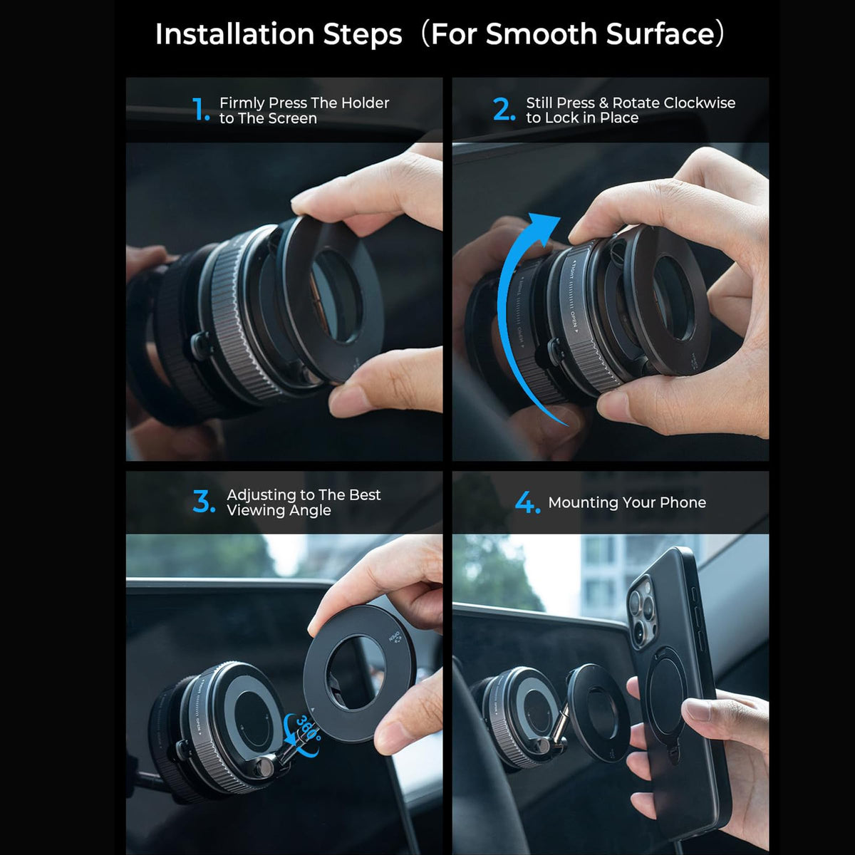 1. The Cell Phone Holder With Manual Rotating Suction Cup Magnet Can Be Used On Smooth Surfaces Such As Front And Rear Window Glass, And The Included Sticker Can Be Mounted On The Dashboard. Please Try To Keep The Contact Surface Dry And Dust-Free Before Use And Avoid Direct Sunlight. 2. Car Double Sided Cell Phone Holder. There Is A Rotating Ring On The Top Of The Suction Cup, Gently Rotate It And The Suction Cup Will Be Automatically Attached To Smooth Surfaces; Rotate It In The Opposite Direction And Hold The Round Piece On The Edge Of The Suction Cup To Remove It. 3.360 Rotatable Magnetic Adsorption Cell Phone Holder Is Suitable For Car Windows, Windows, Dashboards, Kitchen And Bathroom Walls, Mirrors, Pure Metal Fitness Equipment And Some Smooth Surfaces. 4.This Product Includes A Cell Phone Holder, A Cleaning Kit, A Round Pc Pad And A Metal Ring.