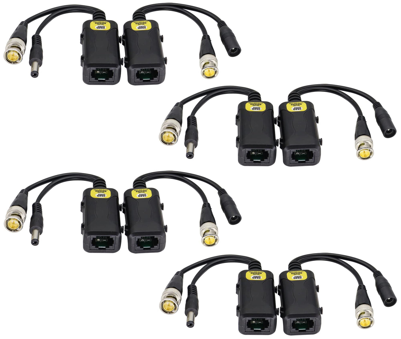 Size:Length(16.5Cm/6.5Inch)Colour:(Black) Package Quantity:(4 Pairs)Material:Plastic+Metalconnectors : Rj45 Female To Bnc Male +Dc 5.5 X 2.1Mm Female /Male Jack Adapter Cablethis Video Baluns Will Allow You To Transmit Video Over Cat5/Cat5E/Cat6 Cable Up To 984Ft. Dc Power Maximum Transmission Is 200 Meters/656Ft.Dc Power Supply With Led Indicator, Input And Output 12V-48V Voltage.Anti-Thunder Protection Rating: 3Compatible Format:Hd-Cvi,Hd-Tvi,Hd-Ahd,Cvbs.Resolution:720P 960P 1080P 3Mp 4Mp 5Mp 8Mp.(Cvi/Ahd/Tvi/Cvbs)Maximum Distance Length: (720P 960P :300 M/984Ft )(1080P 3Mp 4Mp 5Mp 8Mp:200 M/656Ft )Cablecategory Type:Cat5/Cat6.Esd:1A Contact Discharge Electricity Lever 3, 1B Air Discharge Electricity Lever 3, Per:Iec61000-4-2.Coaxial Cable Connector:2Kv (Common-Code)Per:Iec1000-4-5.Utp Cable Connector:2Kv (Different-Code),4Kv (Common-Code)Per:Iec1000-4-5.Overview:This Is Video Power Transmitter And Receiver That Allows The Transmission Of Real Time Cctv Hd Video Power Signal Via Cost Effcetive.Unshielded Twisted Paired(Upt) Cable. Baseband (Composite) Signals Of Any Type Are Support Is. Its Compatible With All Hd Tvi, Hd Cvi,Ahd And Cvbs Analog Camera. Used In Pairs, Eliminates Costly And Bulky Coaxial Cable. The Superior Interference Rejection And Low Emissions Of Allow Video Sigmals To Coexist In The Same Wire Bundle Ad Telephone , Datacom, Or Low Voltage Power Circuits . This Allows The Use Of A Shared Or Existing Cable Plant. Built In Surge Suppressor To Protect Video Equipment Against,Damaging Voltage Spikes. Its Crosstalk And Noise Immunity Ensure Quality Video Signals. Note: Rj45 Video Balun Is Not Waterproof. For Indoor Use Only. If These Baluns Are Used In Completely Outdoor Without Any Shelter, Please Wrap Them With Waterproof Tape After Having Connected To Your Cameras.Note:Make Sure The Rj45 For Camera Side And Dvr Side Are The Same Standardswrongfully Mixing The Colors May Result In Burning The Camera And Devices.