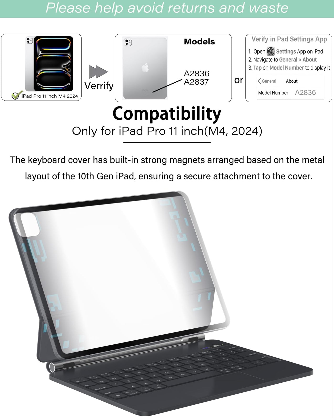 Q: Is the ZENLU iPad Pro 11 M4 2024 Case compatible with other iPad models?A: The ZENLU iPad Pro 11 M4 2024 Case is specifically designed for the 11-inch iPad Pro 5th Generation (M4, 2024) models A2836 and A2837. It is not compatible with the iPad Air 11 inch (M2, 2024) or any other iPad models. Please verify compatibility by checking the model number on the back of your device.