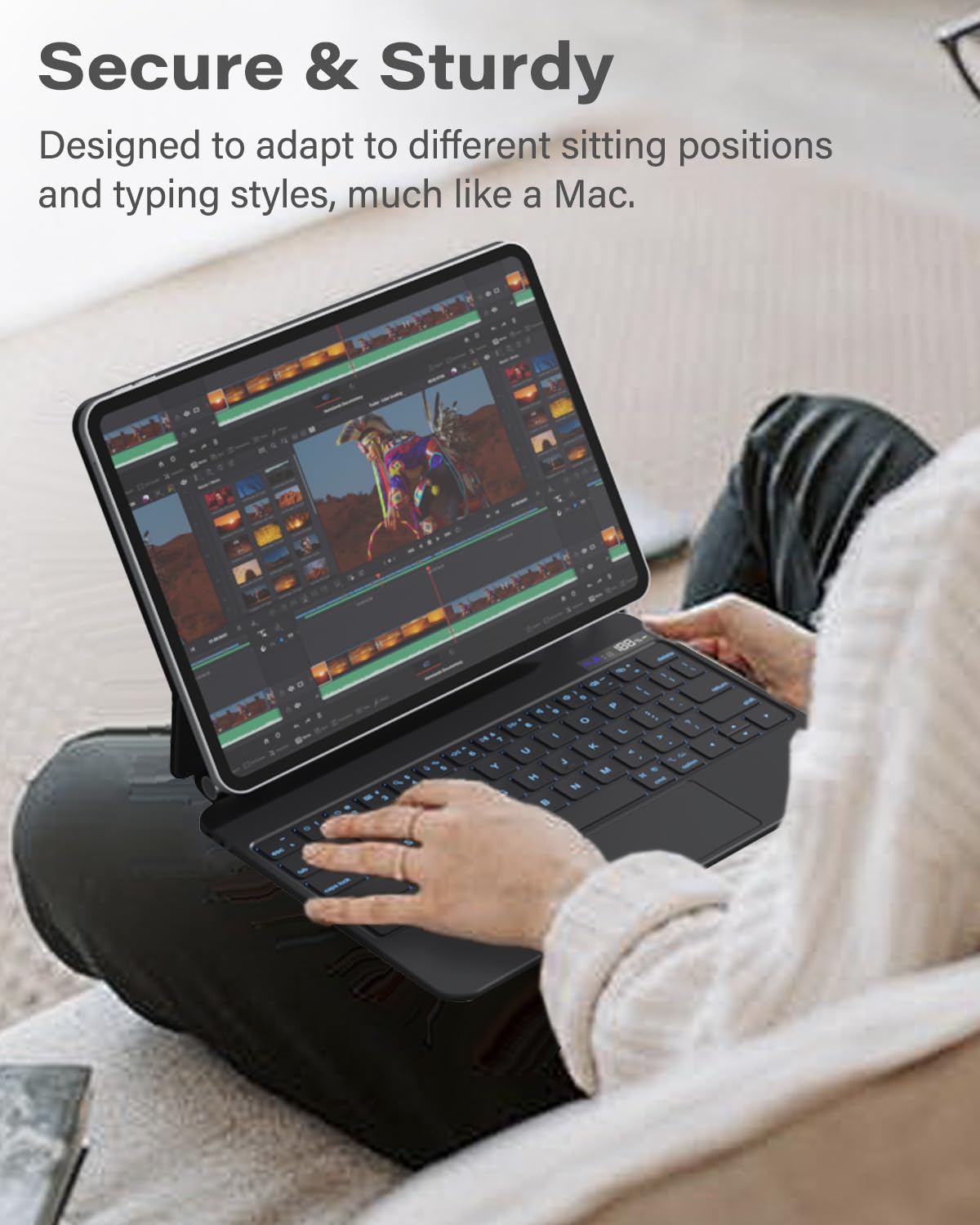 Q: What features does the ZENLU keyboard case offer for productivity?A: The ZENLU keyboard case includes a Magic-Style keyboard with a multi-touch trackpad, full gesture support, and a row of iPadOS shortcut keys for enhanced productivity. It allows for smooth navigation, document editing, and web browsing, making it an excellent choice for users who want a laptop-like experience.