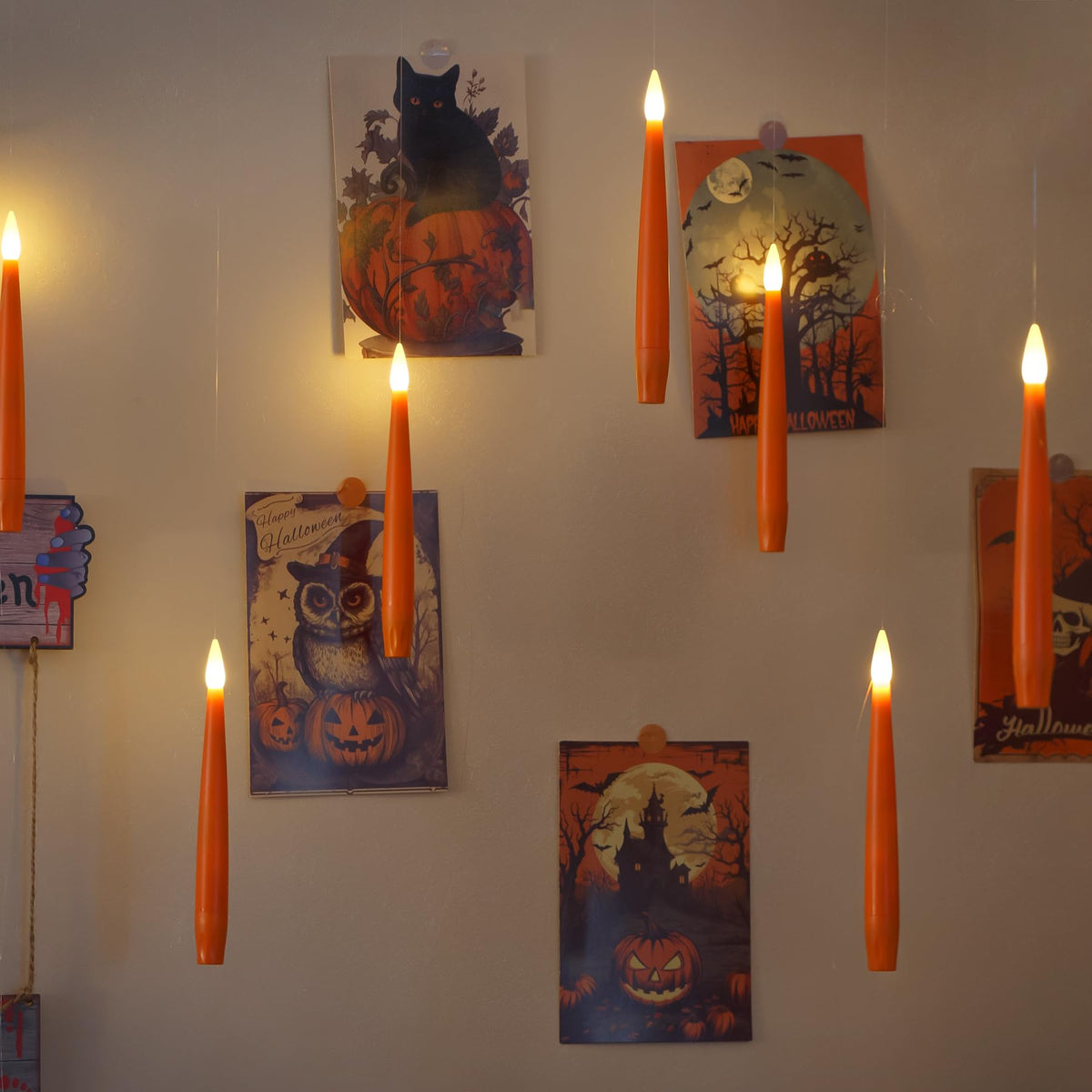 Q: How do I hang the floating candles securely?A: The floating candles come with a 130-foot roll of clear line and 12 hooks, allowing you to securely hang them vertically for an attractive display without worrying about them falling.