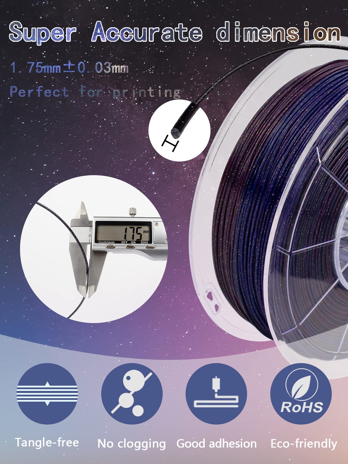 Hot Features] Gradient Multicolors With Sparkling Dots, Like The Twinkling Stars Spread Across The Deep Sky, Impressed By The Beauty Of Starry Sky Packing] Net Weight 1Kg (22Lbs) Filament, Vacuum Sealed With Desiccant Dimensional Accuracy And Consistency] Diameter Tolerance At +-003Mm Strict Control Of Diameter Accuracy To Guarantee A Smooth Printing Clog-Free, Tangle-Free, Bubble-Free] Upgraded Winding System To Guarantee A Tangle Free And Continuous Printing, Adequate Drying During Manufacturing To Guarantee A Bubble Free Printing After-Sales Service] We Are Always Ready To Help You Happy Printing Experience And Shopping Experience With Us Is What We Value Most Any Questions, Please Feel Free To Contact Us, We Will Offer You A Satisfactory Solution