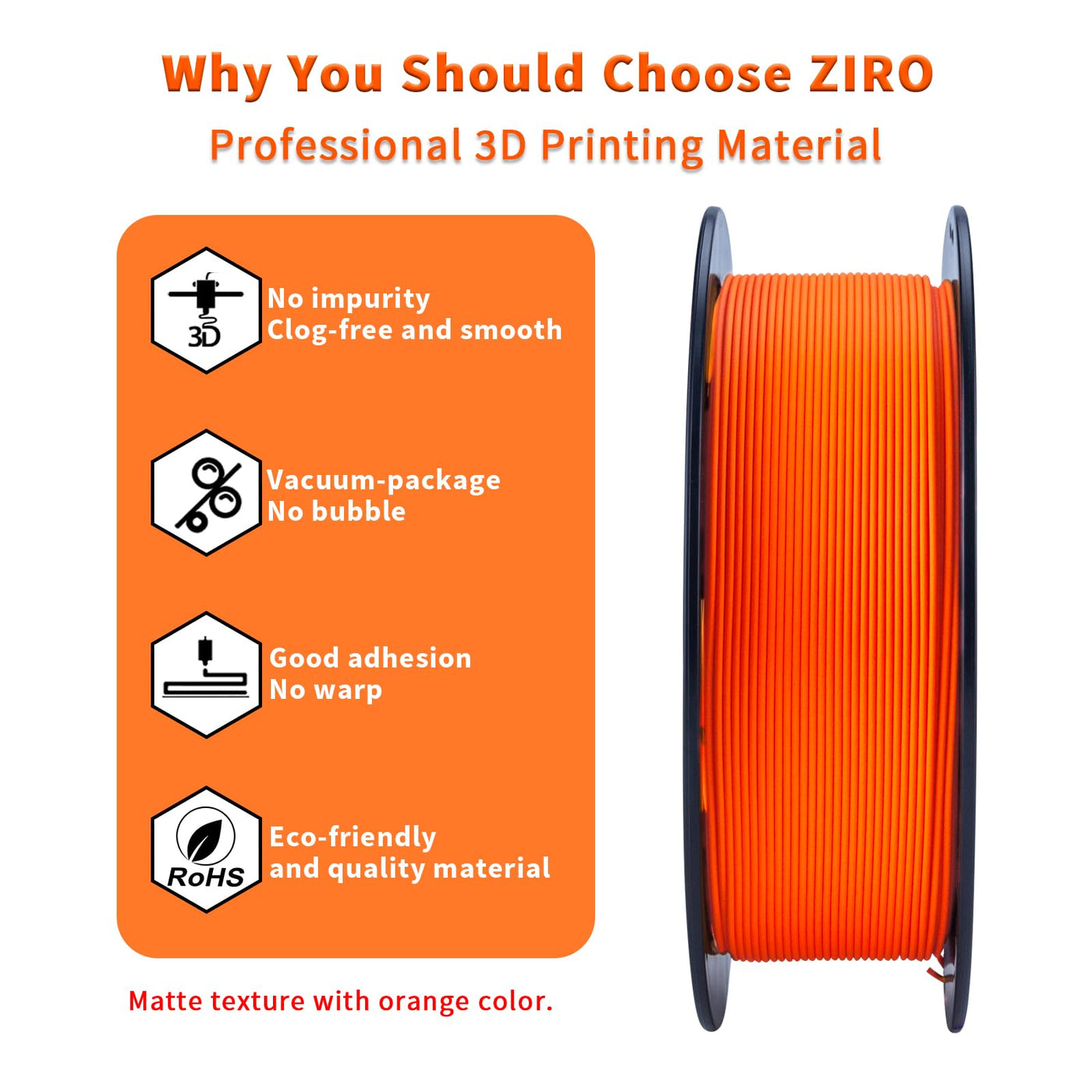 Hight Quality Matte Pla]- The Matte Orange Pla Filament Achieves A Shine-Free, No-Gloss Look, Its Fantastic Frosted Texture Gives Your 3D Works A Modern And Enigmatic Appearance It Is Made Of Premium Raw Material, Which Features Excellent Printability: Good Ductility, Higher Strength, No Odor, No Warp, Clog-Free, And Bubble-Free Allowing 3D Printing Enthusiasts To Create Stunning Works With Fewer Issues Neatly Wound And Tangle-Free]-Our Ziro Filament Uses Full Mechanical Wire Winding To Avoid Tangles And Knots During Printing And Completely Drying For 24Hrs Before Vacuum Sealed Moisture-Free And Bubble-Free To Make 3D Printing Much Easier (Please Remember To Store The Filament With The Re-Sealable Bag After Use To Keep It Dry) 175Mm Filament Accuracy ]- Advanced Ccd Diameter Measuring Control The Dimensional Accuracy Of The Pla Is +- 003Mm The Strict Tolerance Guarantees That Ziro Filament Printing Is Easier And More Stable Spool Diameter: 799Inch, Spool Width: 248Inch, Hub Hole Diameter: 236Inch Suggested Printing Settings, Nozzle: 190-220Ac, Bed: 50-60Ac, Speed: 30-90 Mms Ps: Hardened Nozzle And Gear Is Recommended To Print Matte Pla) Fits For Almost All Fdm Printers]- Ziro 3D Printing Filament Works Perfectly With Most Printers On The Market A Plastic Reel With A Larger Inner Diameter Design Makes Feeding Smoother What You Will Get]- 22 Lbs Black Vacuum-Packed Pla Filament + A Free Reseal Bag + A 5M Cleaning Filament + A 5M Random Filament Sample And Our Friendly Customer Service If You Have Any Questions Or Suggestions, Please Get In Touch With Us We Will Do Our Best To Solve Your Problem