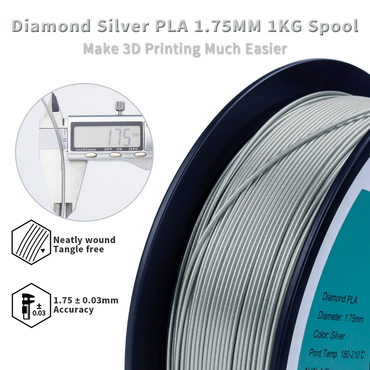 Ziro Shiny Sparkle Pla Filament With Glitter, Shining 3D Printer Pla Filament 1.75Mm, Diamond Series 1.75 1Kg/2.2Lbs Spool, Neatly Wound, Fit Most Fdm 3D Printers, Dimaond Silver