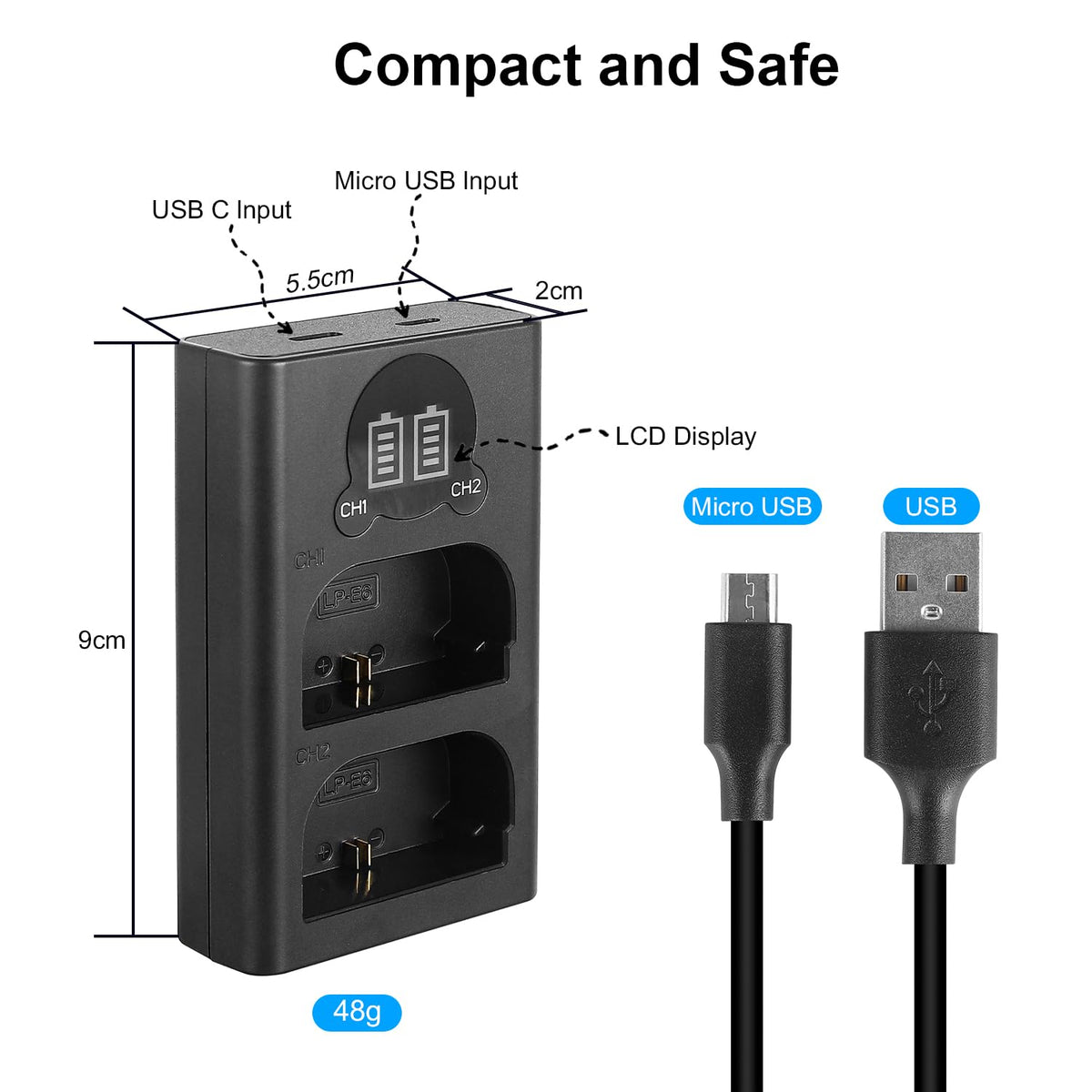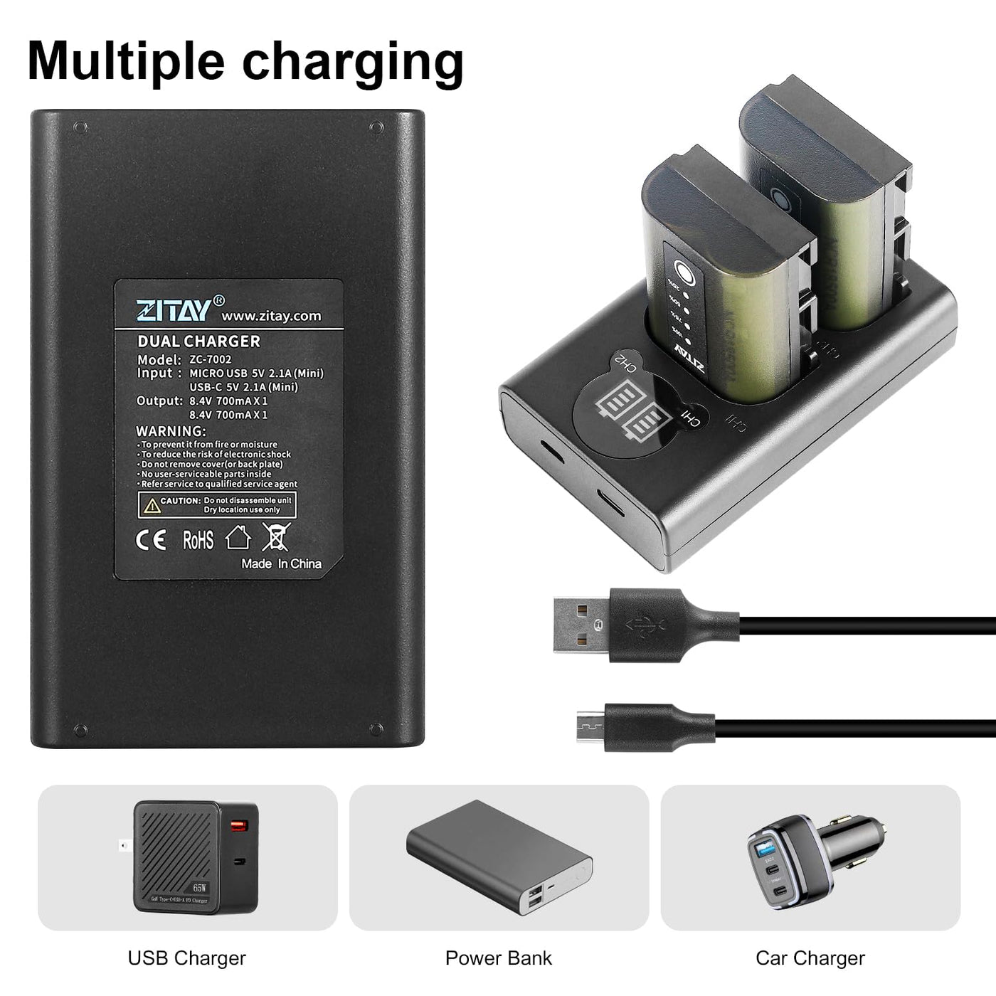 Q: What type of charger is included with the ZITAY LP-E6NH battery kit?A: The ZITAY LP-E6NH battery kit includes a dual charger dock that supports both USB-A and USB-C inputs, providing versatile charging options with USB adapters, car chargers, and power banks.