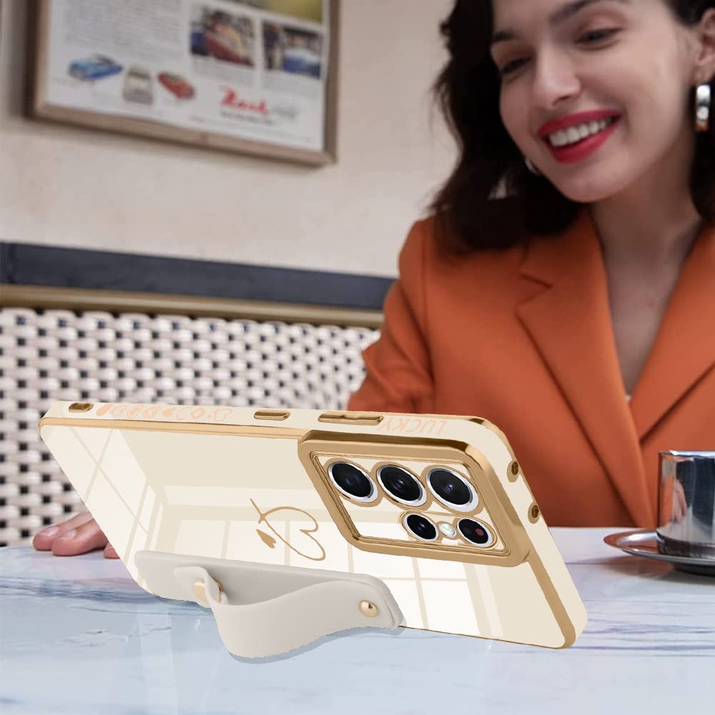 Ziye Compatible With Galaxy S22 Ultra Case Love Heart Plating Phone Cases With Adjustable Wristhand Kickstand, Full Body Protection Shockproof Drop Protection Cute Case Cover