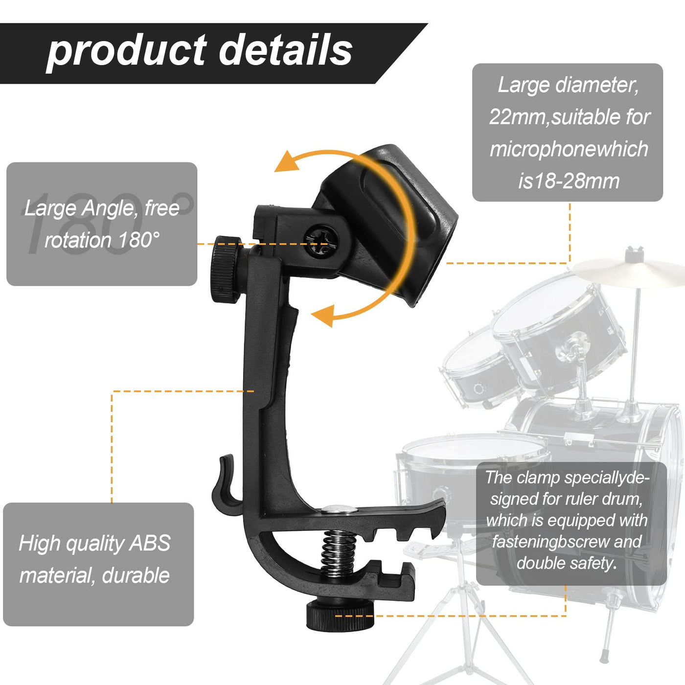 ?Product Material?:Metal+Plastic ?Including Accessories?:2*Drum Clips ?Product Packaging?:Carton ?Package Size?:13.5*8*5.5Cm ?Product Net Weight?:144G &Nbsp;&Nbsp; ?Product Gross Weight?:166G ?Product Specifications?:The Diameter Is 22Mm, Suitable For 18-28 Microphone. ?Product Design?: With This Microphone Drum Clip Can Adjust The Height And Tilt Of The Microphone, Convenient For Close Recording.